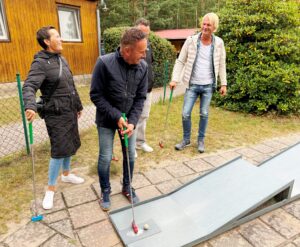 Um die süßen Kalorien wieder loszuwerden, entschied sich ein großer Teil der Anwesenden, sich sportlich zu betätigen. Zur Auswahl standen Minigolf, Beachvolleyball und Badminton, aber auch einige Skatspieler fanden sich. So hatten alle etwas bis zum Abendessen zu tun und nebenbei wurde über „Gott und die Welt“ gesprochen. Nach den Aktivitäten wurde wieder an das leibliche Wohl gedacht.