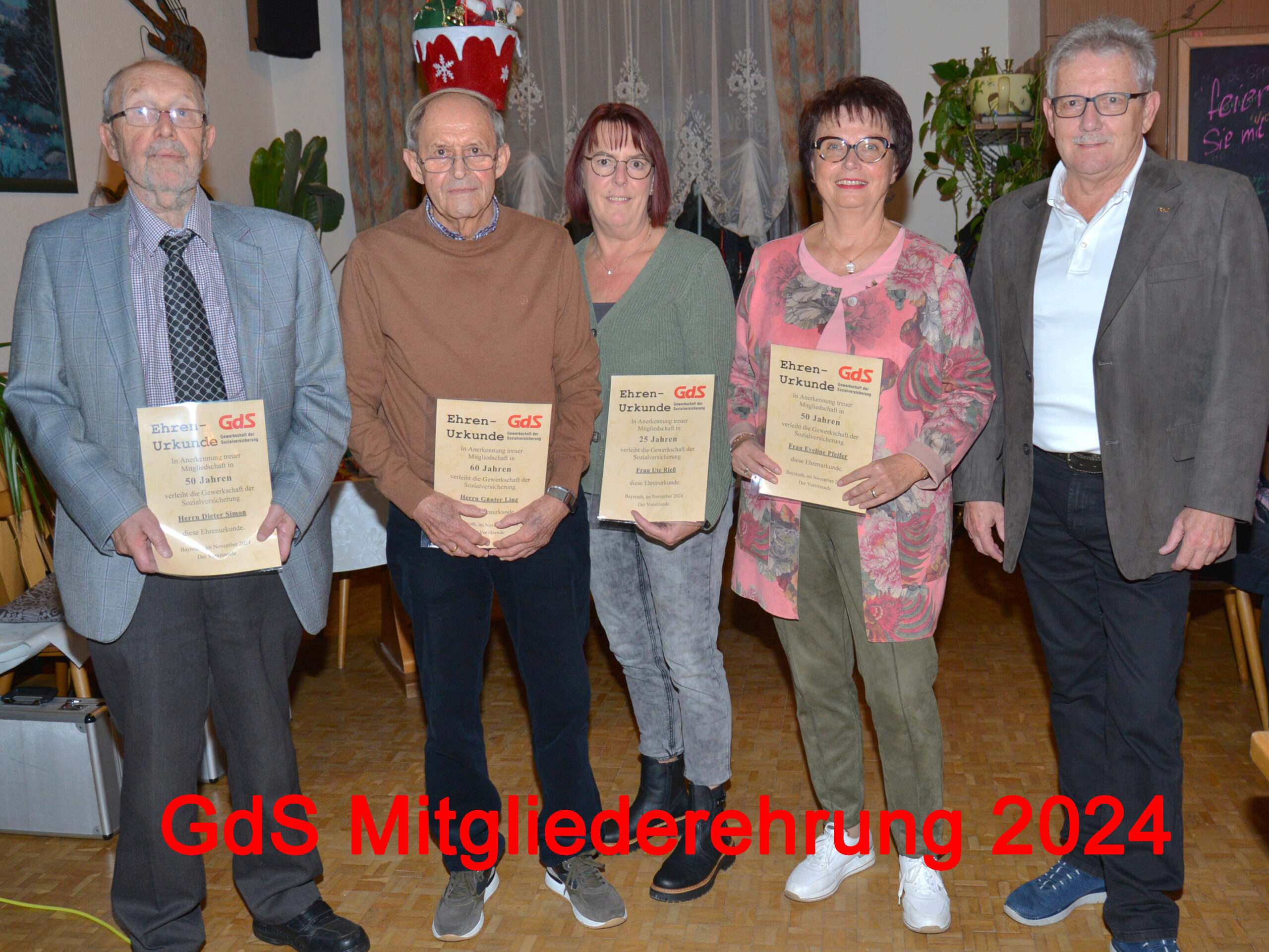 Im Anschluss dankte Rudi Schindelmann Günter Linz für 60 Jahre Treue zur GdS, Evelin Pfeifer und Dieter Simon für je 50 Jahre GdS-Mitgliedschaft sowie Ute Rieß für 25 Jahre Zugehörigkeit zur GdS und überreichte ihnen jeweils eine Ehrenurkunde. Beim gemütlichen Teil des Abends wurde sich rege ausgetauscht und in Erinnerungen geschwelgt, bevor man sich bis zum nächsten Treffen verabschiedete.