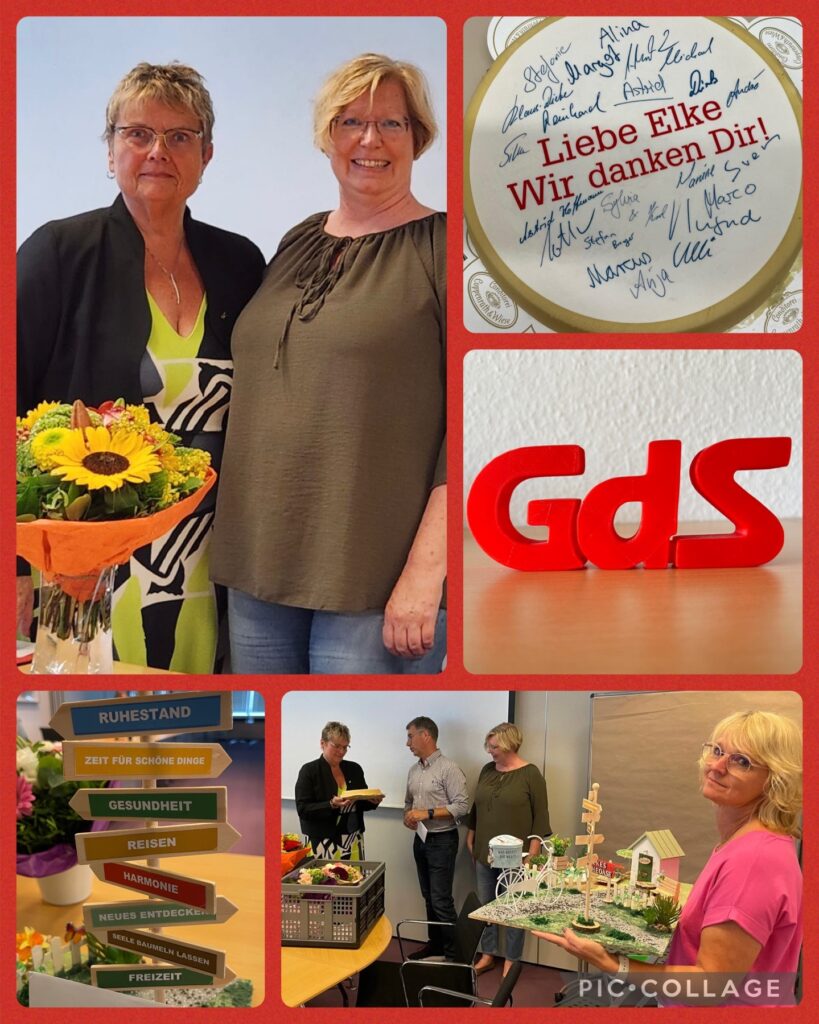 Die GdS in der DRV Rheinland bedankt sich bei Elke für ihre hervorragende Gewerkschaftsarbeit in der langen Zeit ihres Vorsitzes. Mit ihrer liebevollen Art hat sie sehr viele Beschäftigte der DRV Rheinland mit Rat und Tat unterstützt und ihnen geholfen. Ebenso herausragend war ihr Einsatz als freigestelltes Mitglied im Personalrat. Auch diese Tätigkeit hat Elke sehr lange mit viel Engagement und voller Energie ausgeübt. Ihre Meinung und ihr Rat wurden überall sehr geschätzt. Eine wirklich außergewöhnliche Frau verlässt die GdS in der DRV Rheinland!