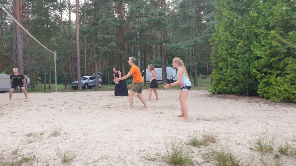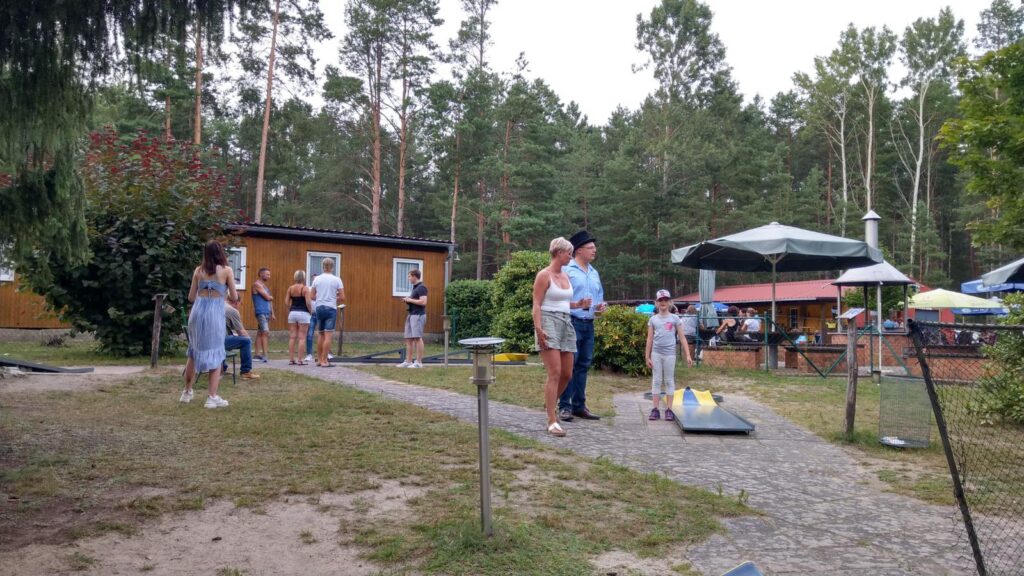 Gegen 18:30 Uhr, als die Volleyballer*innen das erste Mal verschwitz eine  Pause einlegten und ein Großteil der Minigolfspieler mit Ihren 18 Loch fertig waren, gab es Abendessen. Herr Neumann, der Inhaber des SpreeCamps, servierte wieder Leckereien vom Grill, frisch gebackene Pizzen, auch  Vegan, und 3 verschiedene Salate, die ebenfalls  frisch zubereitete waren. Vor und nach dem Abendessen wurden viele interessante Gespräche geführt, Neuigkeiten ausgetauscht und die politische Lage diskutiert.