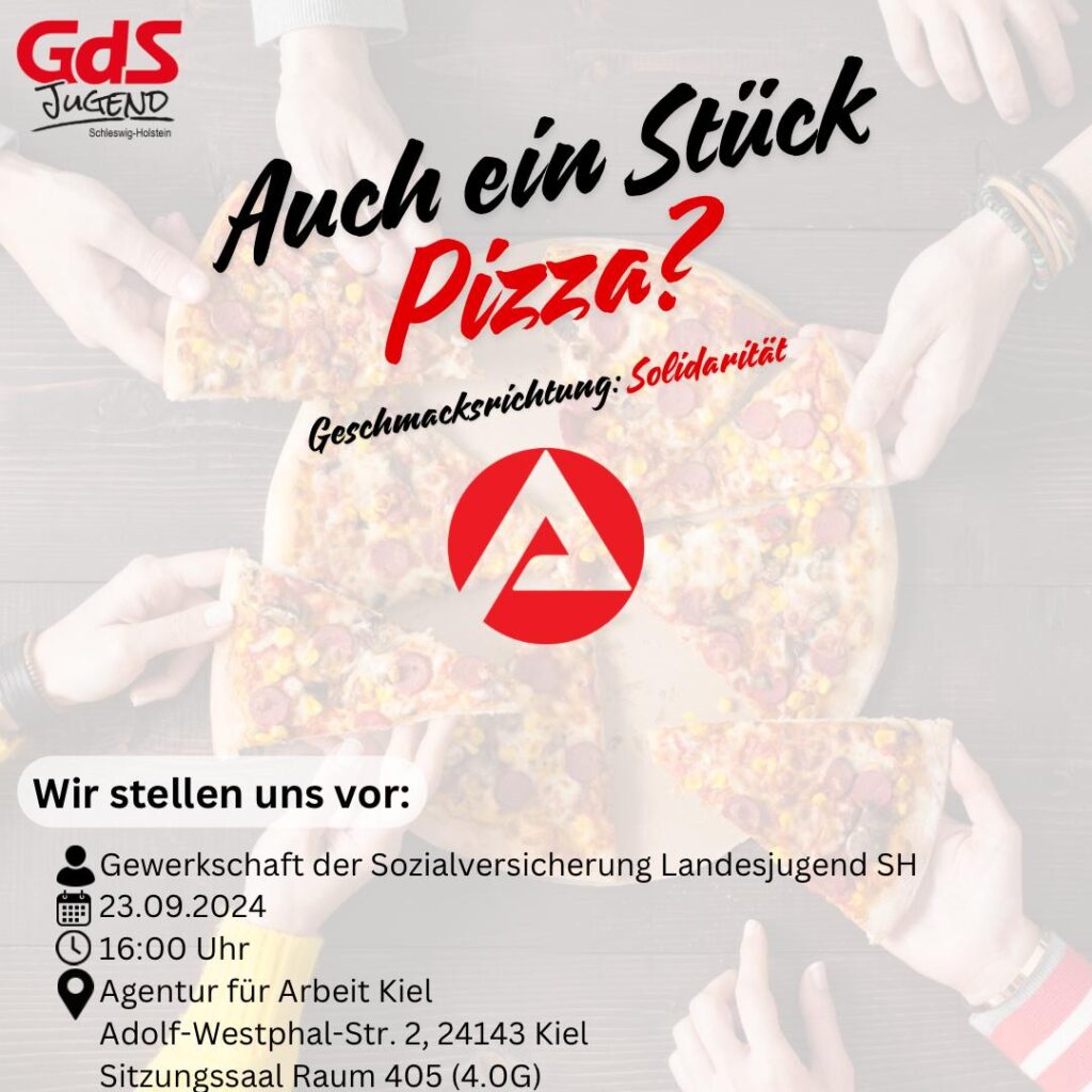 Am 23. September 2024 war es endlich soweit … Wir haben uns gemeinsam mit den neuen Nachwuchskräften der Agentur für Arbeit aus Schleswig-Holstein in Kiel getroffen. Trotz der langen Abreise (zum Beispiel aus Lübeck oder Neumünster) konnten wir Überzeugungskraft leisten und einige Personen noch nach dem offiziellen Feierabend um 16 Uhr bei einem Stück Pizza (Geschmacksrichtung Solidarität) und einer Cola für unseren Vortrag gewinnen.
