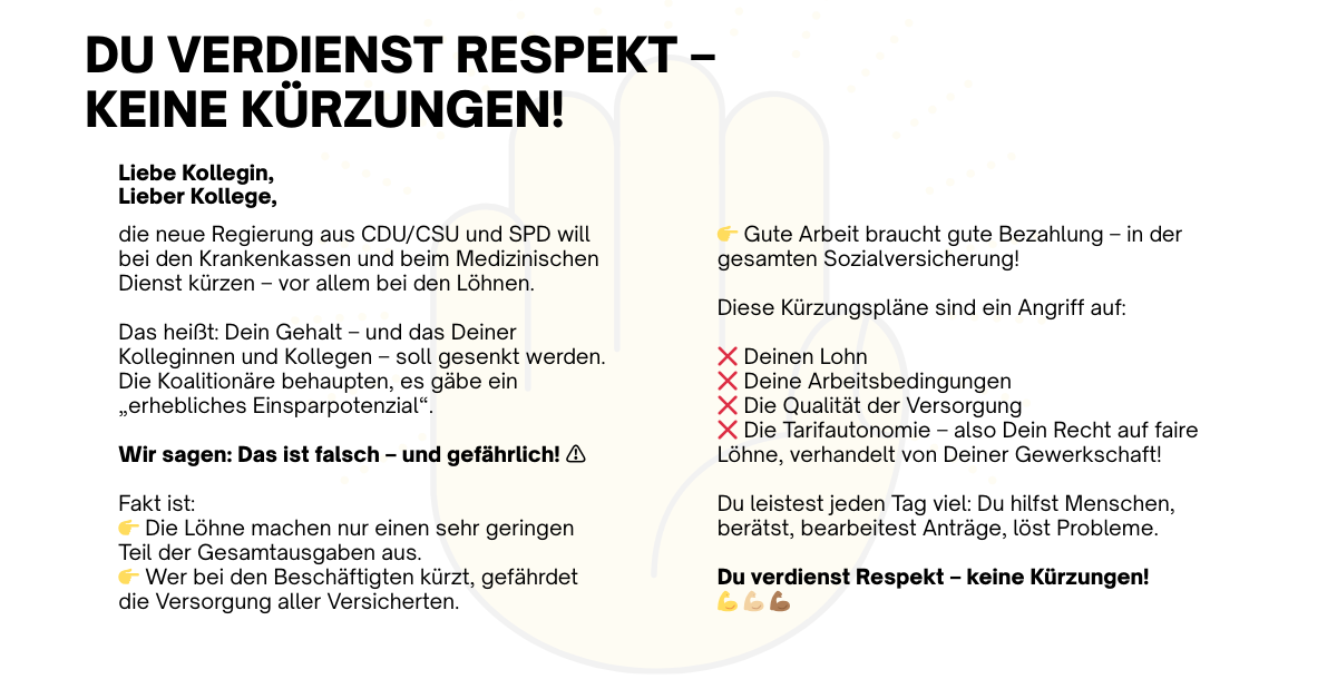 ✔️ Erklär ihnen, was die Kürzungen bedeuten: Weniger Lohn, schlechtere Versorgung, Einschränkung der Tarifautonomie.