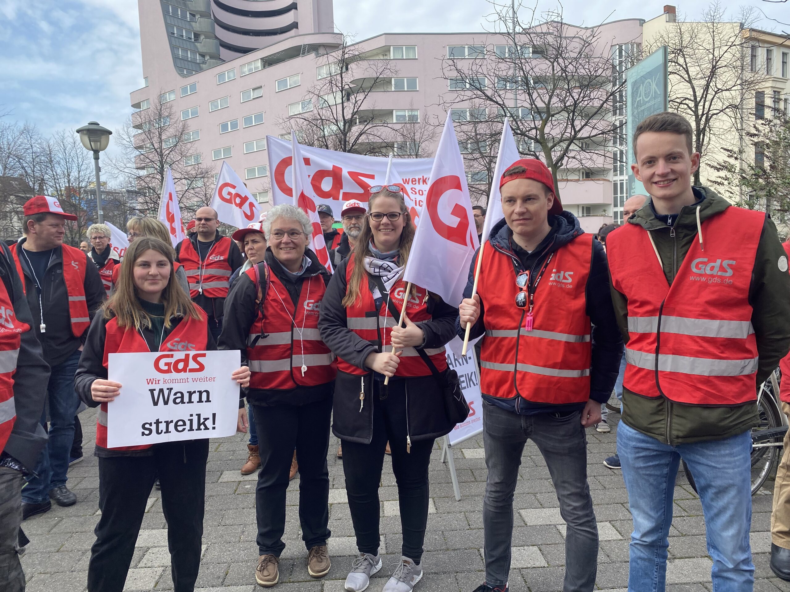 Vorher haben die Mitglieder der GdS noch an einer Solidaritätskundgebung vor den Türen der AOK Nordost teilgenommen. Die AOK Nordost hat noch nicht mal den letzten Tarifabschluss umgesetzt.