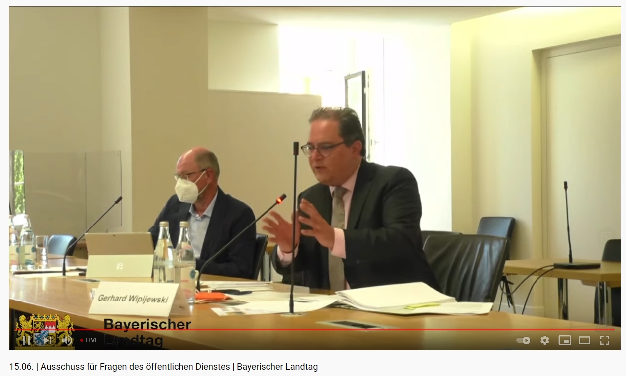 Mitte Juni fand im Landtagsausschuss für Fragen des öffentlichen Diensts eine Sachverständigenanhörung zum BayPVG statt. Angesichts der Novellierung des Bundespersonalvertretungsgesetzes (BPersVG) wurde die Frage diskutiert, ob und in welchem Maße auch eine Überarbeitung des BayPVG für wünschenswert gehalten wird. Der stellvertretende BBB-Vorsitzende Gerhard Wipijewski war als einer von acht Sachverständigen aus den Bereichen Gewerkschaft, Personalvertretung, Wissenschaft und Literatur zur Anhörung eingeladen. Geleitet wurde die Anhörung vom Vorsitzenden des Ausschusses MdL Wolfgang Fackler. Im Vorfeld gab die GdS Bayern eine umfangreiche Stellungnahme ab.