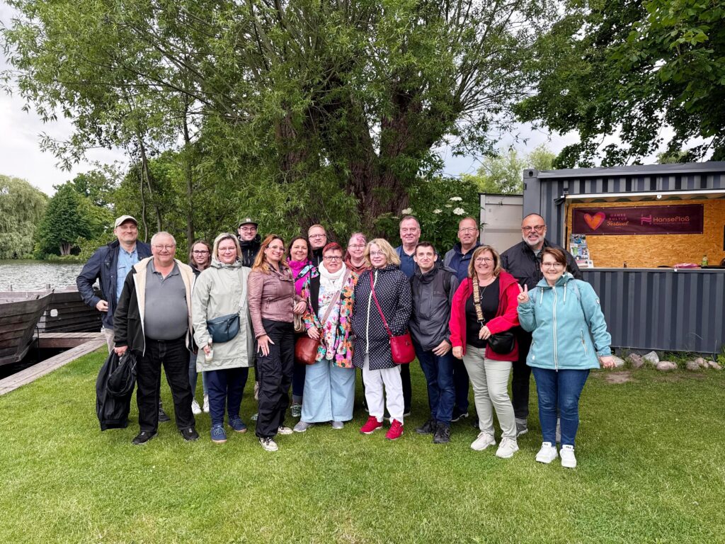 Um dem stressigen Arbeitsalltag zu entfliehen, wurde es für die Mitglieder des GdS-Ortsverbandes Lübeck wieder einmal Zeit für eine gemeinsame Unternehmung. Deshalb haben wir uns am 5. Juni 2025 mit einer stattlicher Anzahl „chillungswilliger“ Kolleginnen und Kollegen nach der Arbeit am Bootshaus Marli in Lübeck getroffen. Ziel war es, mit zwei Flößen in entspannter und entschleunigender Fahrt die Wakenitz, einen Nebenfluss der Trave, zu erkunden.