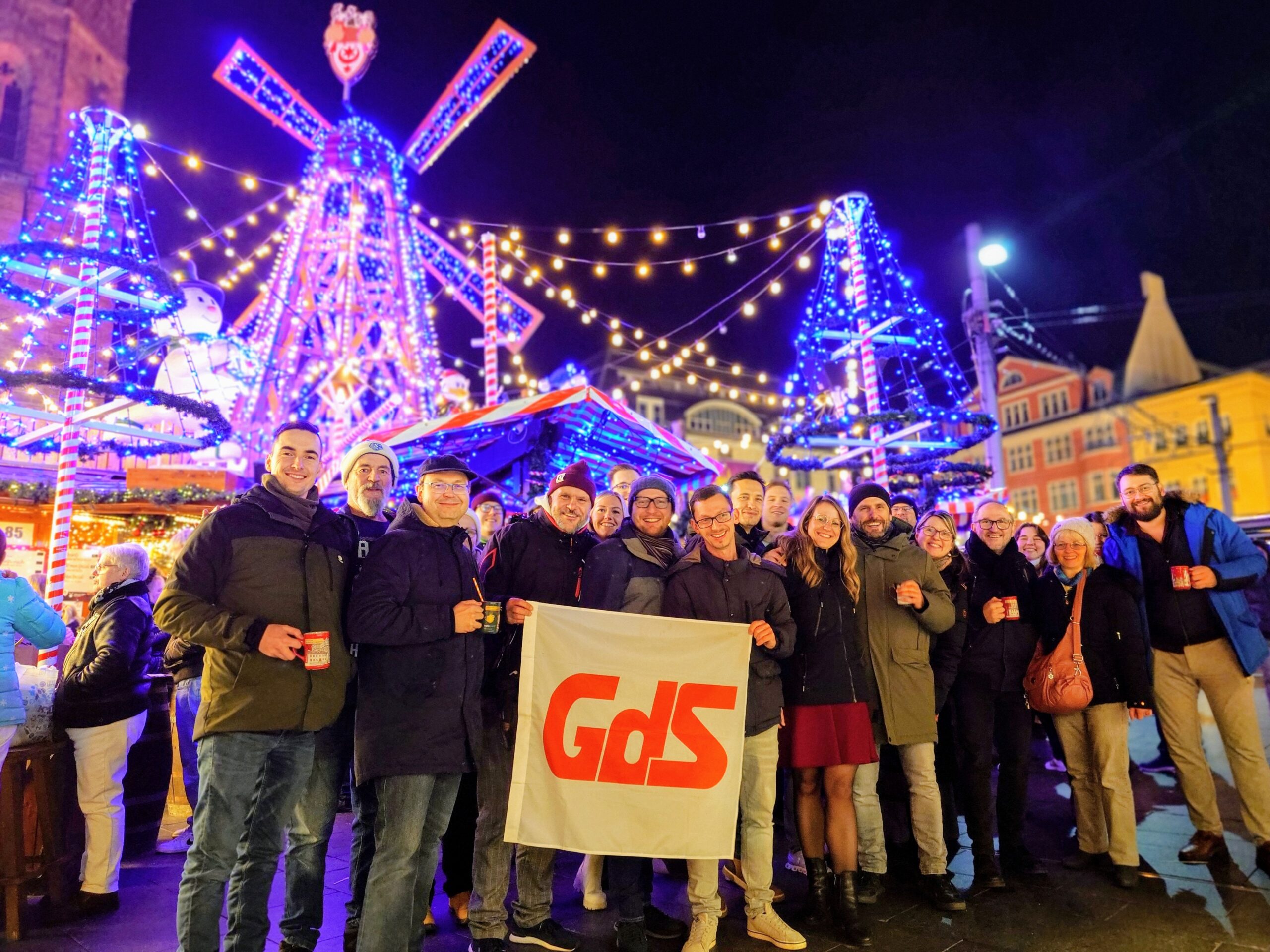 Mit einer erfreulich hohen Zahl an Neumitgliedern ging es anschließend zum Weihnachtsmarkt, der bei angenehmen Temperaturen und trockenem Wetter keine Wünsche offenließ. Einen Anteil daran mögen auch die gewohnt guten Getränke an der „Mühle“ gehabt haben, die seit vielen Jahren unser verlässlicher Partner auf dem Weihnachtsmarkt ist. Besonders zum Gelingen dieses gemütlichen Beisammenseins beigetragen haben aber natürlich unsere Mitglieder, die aus den verschiedensten Dienststellen und Orten nach Halle geströmt sind, um das ereignisreiche Jahr bei anregenden Gesprächen im Kreis der GdS-Familie ausklingen zu lassen.
